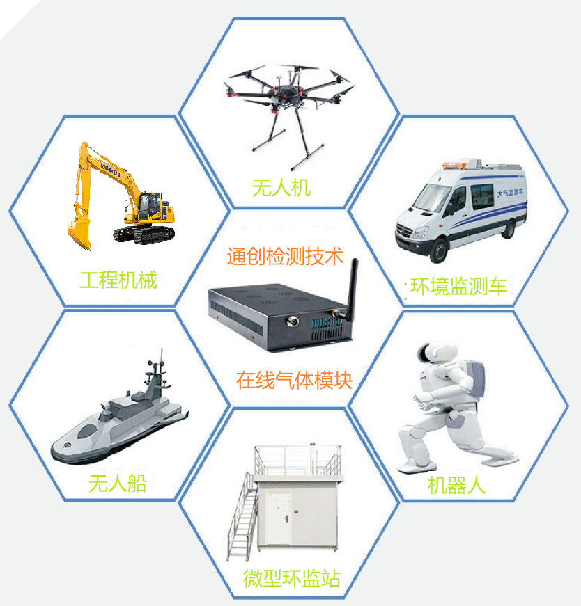 多旋翼无人机、固定翼无人机、直升机、工程机械、无人车、无人船、机器人、大气环境监测系统、智慧城市医院、施工现场,化工园区、企业污染源排放监测,隧道、环境应急突发事故监测、移动执法补充监测等领域。
