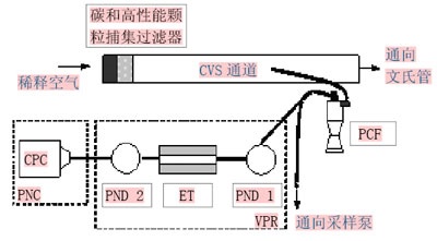 根据PMP在ECE规定R83中指出的测量方法,颗粒数测量系统由分级器(PCF)、加热稀释器(PND1)、蒸发管 (ET)、稀释冷却器 (PND2)及颗粒数计数器(PNC)组成(见图1)。以整车尾气或发动机尾气作为采样气,采样气通过稀释通道进行稀释,并在分级器里排除掉粗大颗粒。为防止形成新的挥发性颗粒,加热稀释器用150℃以上的加热空气来稀释排气,然后用加热到300~400℃的蒸发管蒸发处理现有的挥发性颗粒(加热稀释器、蒸发管、稀释冷却器共同构成了VPR)。随后用稀释冷却器降低挥发性气体浓度,防止颗粒冷凝现象。此稀释过程最大程度地减少了由于热泳而引起的颗粒损失,最后用浓缩颗粒物计数器测量固体颗粒的浓度。