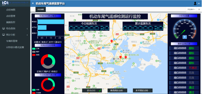 系统监测实现无人值守,检测结果实时显示在LED屏幕上,通过4G网络实现远程数据传输、远程访问与维护。配备通创自主研发的机动车尾气遥感检测平台VERM1000,用于遥感监测数据、林格曼黑度等实时的数据采集、存储、分析及管理等功能。